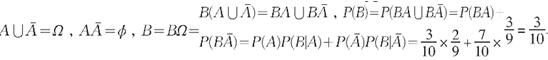分析:不放回的取两次,求第二次必须取到黑球的概率,而第一次可能取到黑球,也可能取到白球,是两个互不相容的事件.若设B表示“第二次取到的是黑球”,A表示“第一次取到的是黑球”,则表示“第一次取到的是白球”,要求P(B),由题意知上例中事件B的发生受到第一次实验结果(两个)的影响,也即是第一次实验的两个结果构成了整个样本空间.