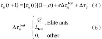 在传统蚁群算法中,当所有的蚂蚁都经历完1次迭代后,才会更新信息素,所有蚂蚁的信息素都会参与到信息素的更新中,这会导致某些寻找到非常长路径的蚂蚁,对整个蚁群的路径搜索产生误导,导致算法收敛速度变慢,甚至影响路径的最终收敛值。精英蚁群算法是在传统蚁群算法上,对信息素分配机制进行改进,将每次迭代搜索中,搜索出的最短路径对应蚂蚁的信息素给予额外增强,对行程加权,这有助于算法收敛[15]。