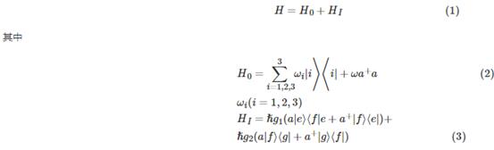 Cn(0)表示任意初始场态的振幅,以及Ca(0)(a=e,f,g)是初始原子态(归一化)|χ〉=Ce|e〉+Cf|f〉+Cg|g〉的振幅,根据这些初始条件,解薛定谔方程,可得到以下系数