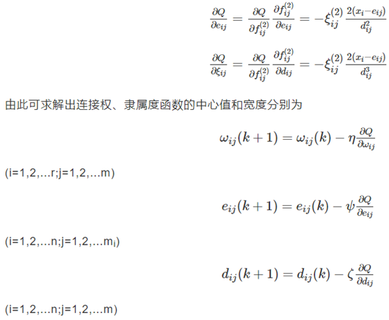 其中,eij和dij分别为神经网络中的第i个输入结点所在的第j个模糊集合的隶属度函数的中心值和宽度,它们均可调。