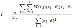 式中,xi为观测值,x¯为xi的平均值,SO=∑i=1n∑j=1nW(i,j),W(i,j)为i,j之间的空间链接矩阵.如果地理要素之间随着测定距离的缩小而变得相似,则它们呈空间正相关关系;如果地理要素之间随着测定距离的缩小而存在明显的差异,则它们呈空间负相关关系.