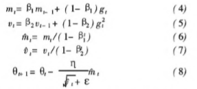 式中Yi是期望输出;Pi是实际网络输出为i类的概率值,即式(2)输出值;C为损失值。本文使用Adam(Adaptivemomentestimation)算法优化模型。Adam算法是一种白适应参数更新算法,通过更新和计算影响模型训练和输出的网络参数,使其逼近最优解,从而最小化损失值。其更新参数方法为:
