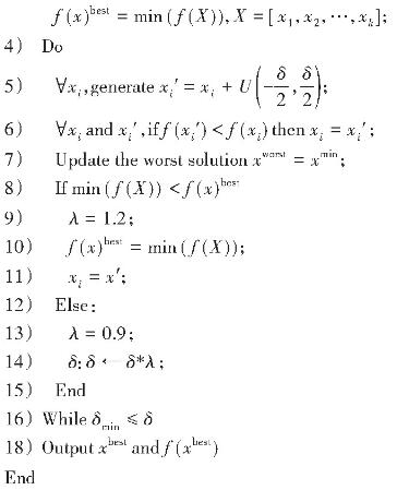 算法初始化自由粒子的个数k,搜索空间的最小值min,最大值max,最后停止迭代的搜索空间的最小值δmin,初始的搜索区间在[min,max],和充分搜索的判定条件c值,实验一般设定c值为10,f(x)表示目标函数。2)~3)行表示随机生成k个解空间中粒子,并计算每个粒子的在目标函数中的函数值,并记录其中最优解f(x)best;4)~12)行表示算法迭代搜索的过程,分别以k个粒子为中心进行均匀分布采样产生新的粒子,采样的尺度跟当前的δ有关。采样后的粒子在目标函数中表现更优的情况下进行粒子的替换,并将当前粒子中的最差用当前k个粒子中的最好粒子更新。若此次迭代过程中的最优值相较上次迭代过程中的最优值没有发生变化,则最优值的优越性系数为2,下次迭代若最优值依然不变,优越系数增加1,如此累计,直到优越系数等于c时,表示此搜索区域已搜索充分,搜索区域减半,进行更精细的搜索。否则,在当前尺度下进行最优值替换,进一步地迭代搜索,尺度不减小。