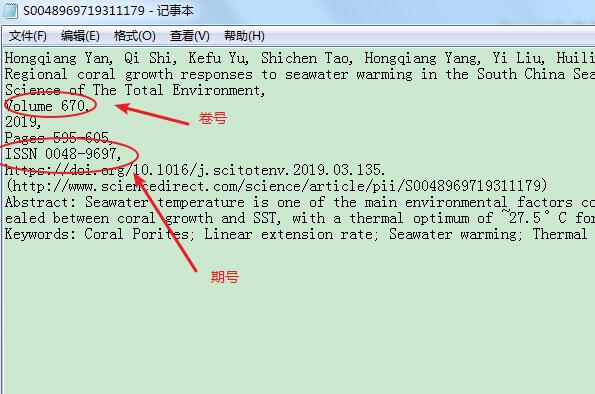 5、导出之后,就可以看到这篇文章中的期刊信息,其中“volume”代表的就是卷号,“ISSN”代表的就是期号。