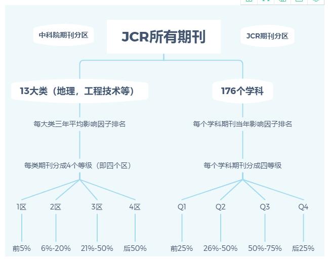 汤森路透JCR分区把某一个学科的所有期刊都按照上一年的影响因子降序排列,然后平均4等分(各25%),分为Q1(1%~25%),Q2(26%~50%),Q3(51%~75%),Q4(76%~100%),其中Q表示Quartile in Category。