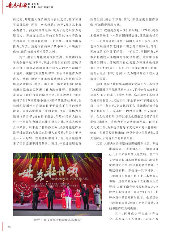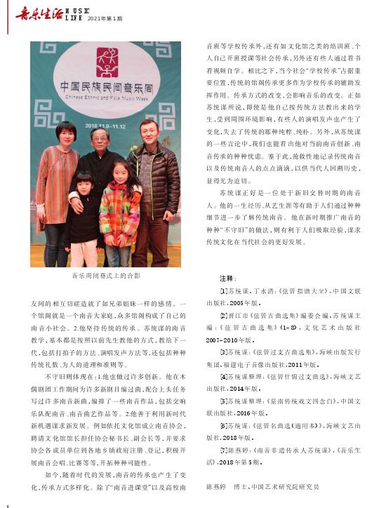 笔者曾在本刊物以《南音非遗传承人苏统谋》一文,简要介绍过他的贡献。生活对他的种种历练以及经由历练而成长并逐渐成熟的艺术之花及艺术感悟,是难以用一篇短文体现出来的。作为一位极为传统的南音人,他的成长经历、他的艺术思考、他为活跃南音界所做的种种努力、他对当前南音传承与创新的看法等等,都能给人们,尤其是研究.学习南音的人以启迪。当前南音人的培养路径及成长环境,与苏统谋这样的传统南音人已经大相径庭,从而也导致了不同的艺术观念和艺术理想。在非遗保护广受关注的今天,了解传统非遗传承人的成长经历、艺术理念,将有利于人们更好地思考非遗保护的措施与方向。
